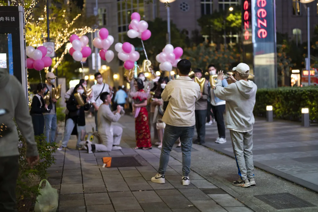 一旁的音樂會喧鬧異常, 但在路口的另外一角穿著大灰鼠裝備的男生正在執行他的求婚計畫! 身旁的朋友, 浪漫的粉紅氣球都在為他打氣!祝福有情人終成眷屬。