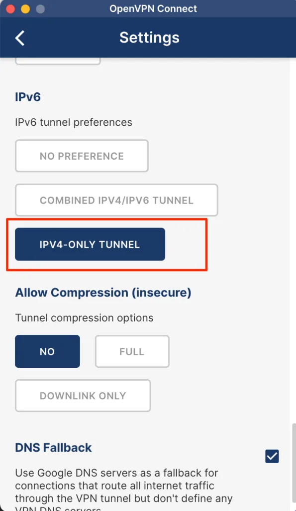 如果你的OpenVPN server 有只有IPv4 的資源, 你可以嘗試更改OpenConnect 客戶端的設定來強迫IPv4的tunnel。