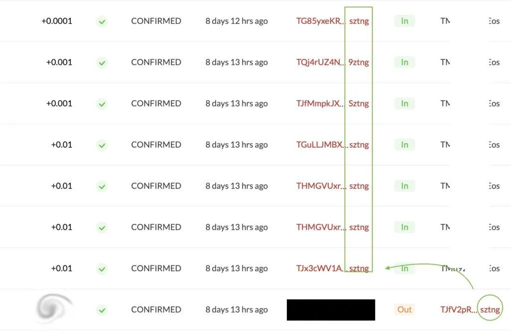 如圖, 我當時轉U去了尾號 sztng 的帳號之後, 馬上就有7個不同的帳戶在第一時間把小額的USDT轉到我的帳戶。 他們的共同點是都是 sztng 結束的。 也就是說會有人看你轉帳後, 用位數雷同的帳號轉錢給妳。
