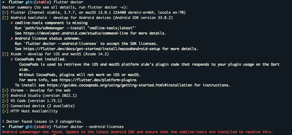 See https://flutter.dev/docs/get-started/install/macos#android-setup for more details.