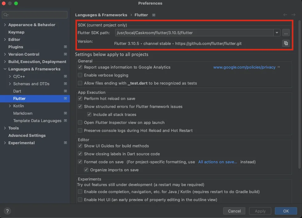 As a site note for AndroidStudio, using the command which flutter => /usr/local/bin/flutter will not work.