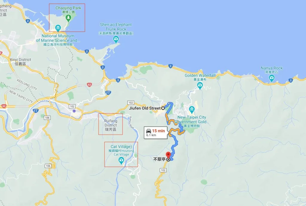 九份開車到不厭亭大約15分鐘, 彎彎曲曲的路大約6.1KM。不厭亭看完日落再到九份泡茶走走是不錯的選擇。