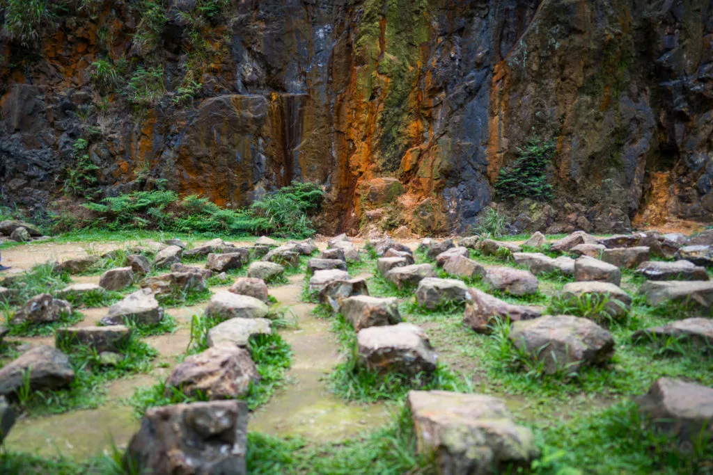 步行到這裡並不遠, 步道都維護的很好, 輕鬆就可以抵達。坐在這外星石頭陣中, 心裏一下子感覺好像小學生準備上課的樣子,一下子又像要準備聽演唱會一樣,坐在石坐往海邊遙望又有一點以管窺天的感覺。 一排排整齊的石坐,兩側顏色鮮豔的山壁是豐富礦石的痕跡。