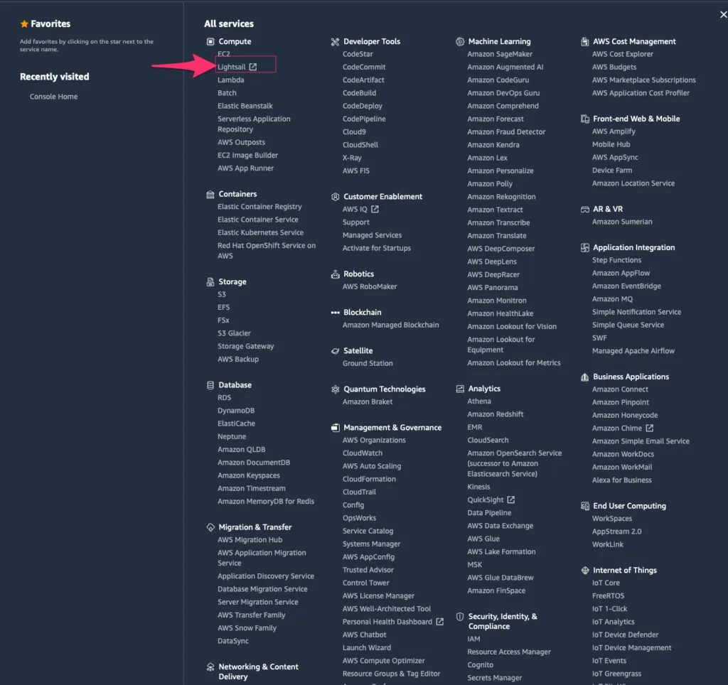 AWS的服務其實多到嚇人。 以下就是他的服務的選單。 但是不要擔心, 我們只需要選擇AWS最用戶友善的服務 Lighsail即可快速的設定好Wordpress。