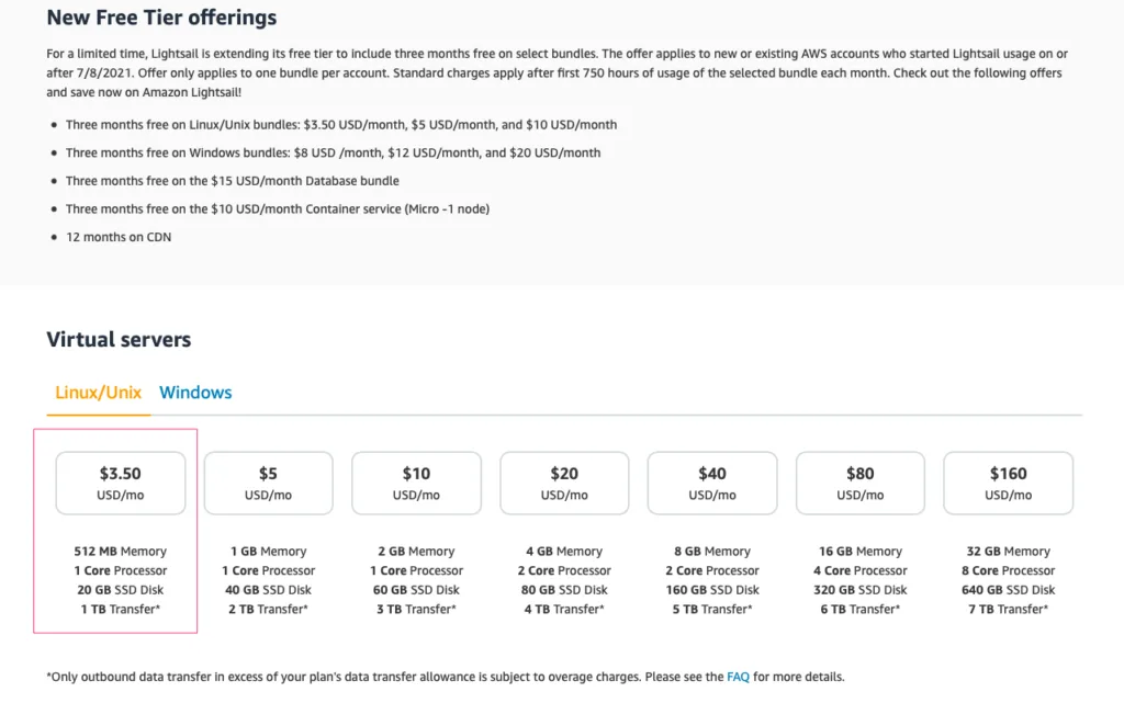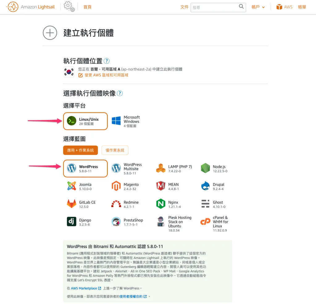 Lightsail 是亞馬遜的簡易伺服器服務選項。 最低只需要每個月 USD3.50. 512MB 和 1TB的流量對於開始經營Wordpress的網站是足夠的。 如果流量變大了, 你可以逐步的升級上去。