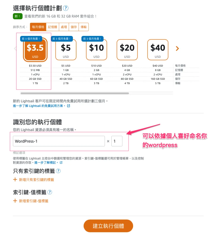 選擇所需的每月配套, 和給自己的Wordpress一個容易記的命名。 然後點擊: 建立執行個體