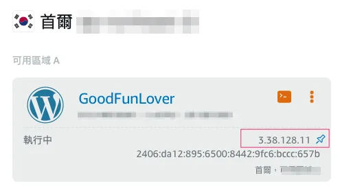 AWS成功建立你的Wordpress 後你就會看到類似以上選項。 記得把你的IP地址永久配給你的Wordpress, 這樣你的IP就不會一直更動。GoodFunLover 的伺服器放在首爾。