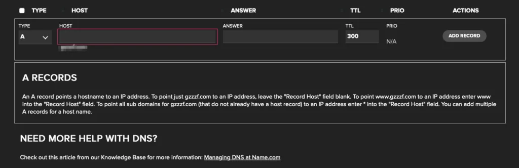 最後一步, 把第四步紀錄的IP回到name.com (或是你選擇購買域名的服務商的網站)去添加2筆 A Type record。這兩筆的相對應的參數如下: