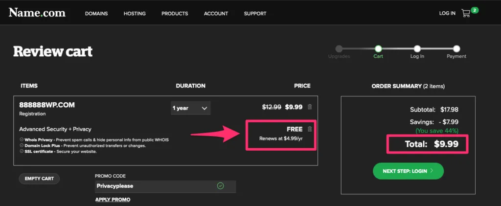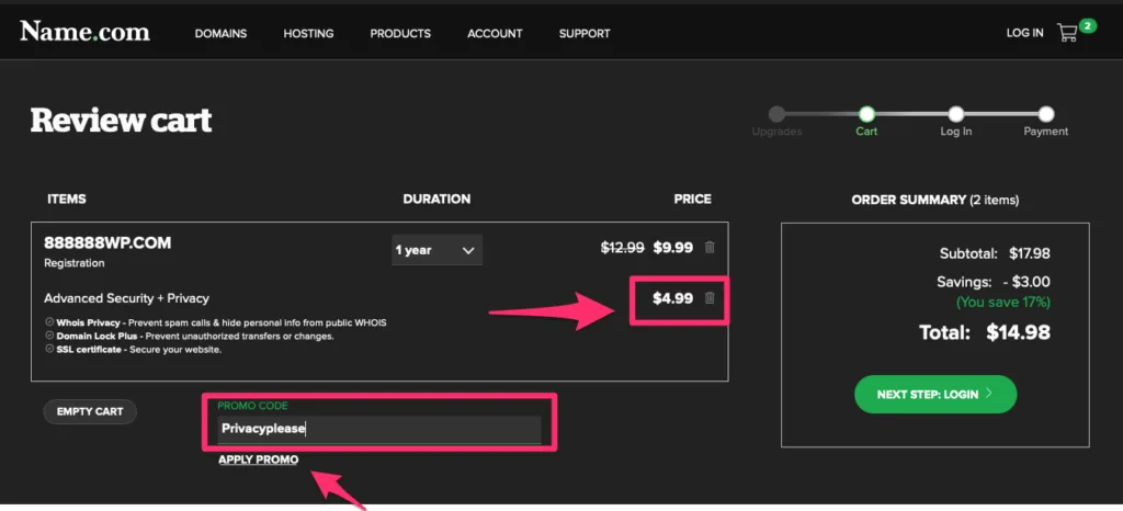 - Whois Privacy 只要你在更新域名的時候輸入優惠代碼就可以省下4.99美金。 這樣一來,一個.com的域名一年差不多9.99美金。