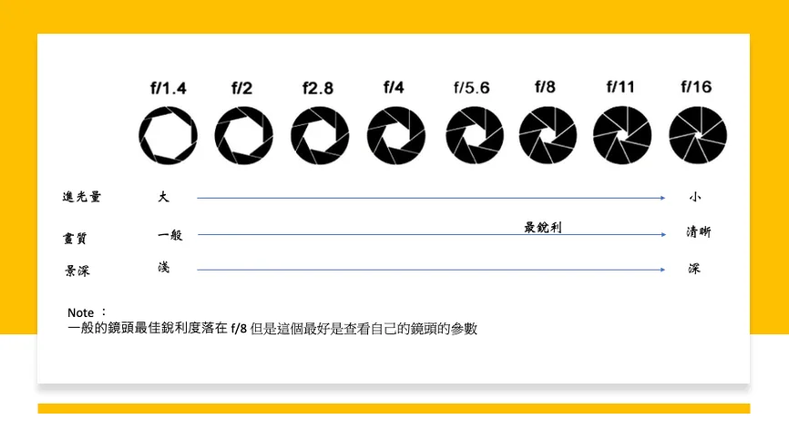 - 嘗試使用 f/5.6 , f/8 和 f/11 來處理照片不要都適用 f/1.4.
