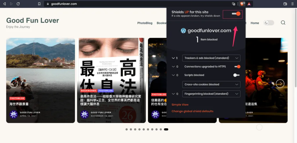 安裝好後的Brave瀏覽器是自動封鎖廣告, 最蹤器和Scripts的, 無需額外安裝其他的插件。但是網站如果因為Scripts的無法執行將會造成網站看似有Bug。 只要關閉這個功能, 就可以正常瀏覽了。