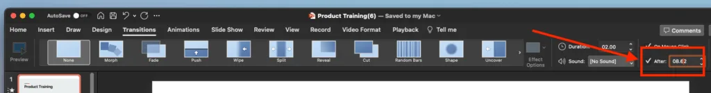 Go to the Transitions effect to adjust the time for the slide and you are done.