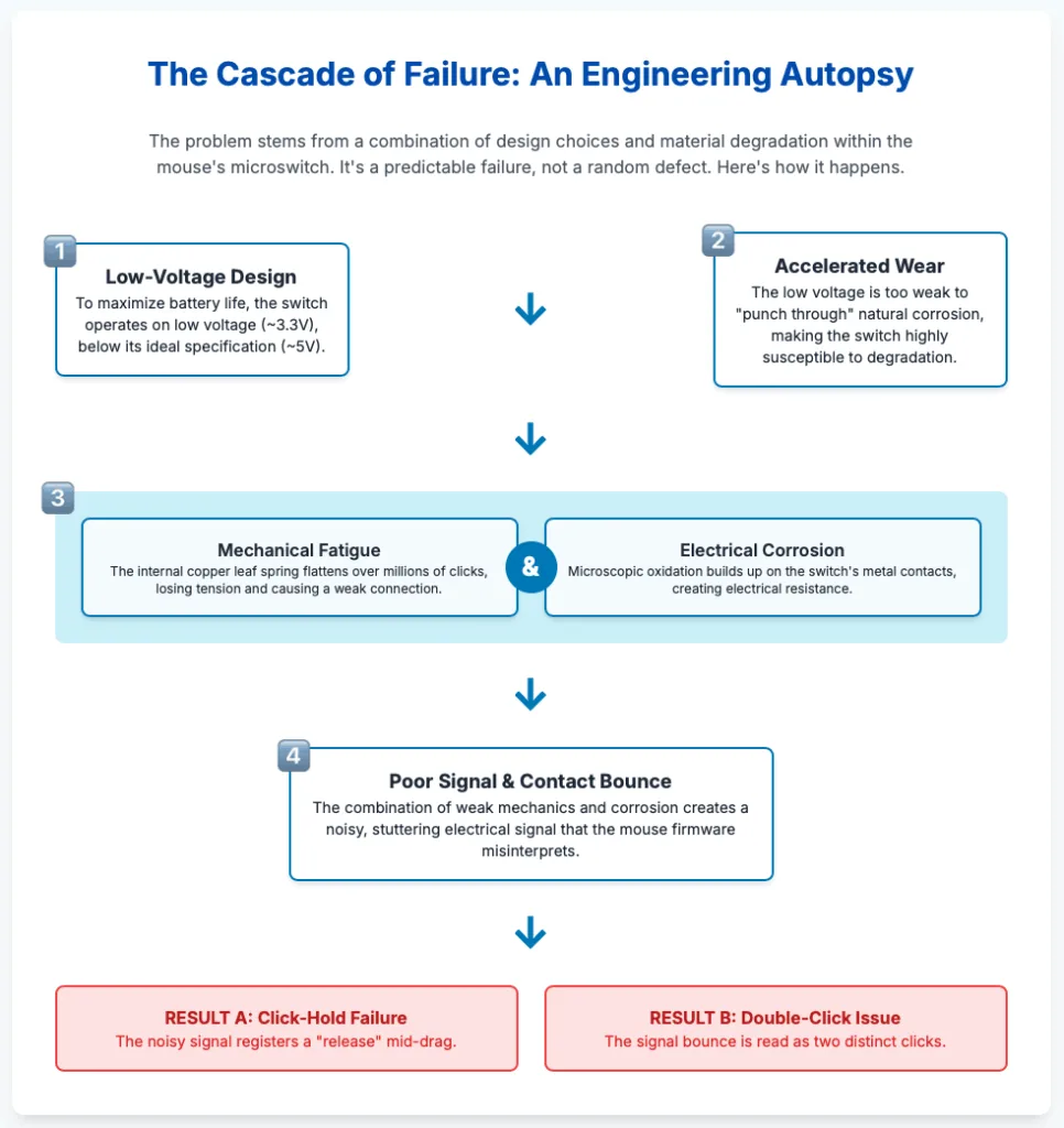 The analysis confirms that the “click-hold failure” and “double-click issue” affecting the Logitech MX Anywhere 3 and its sibling products are not isolated incidents but symptoms of a systemic and predictable hardware failure. The root cause is a cascade of degradation within the Omron D2FC microswitch, driven by a combination of factors: