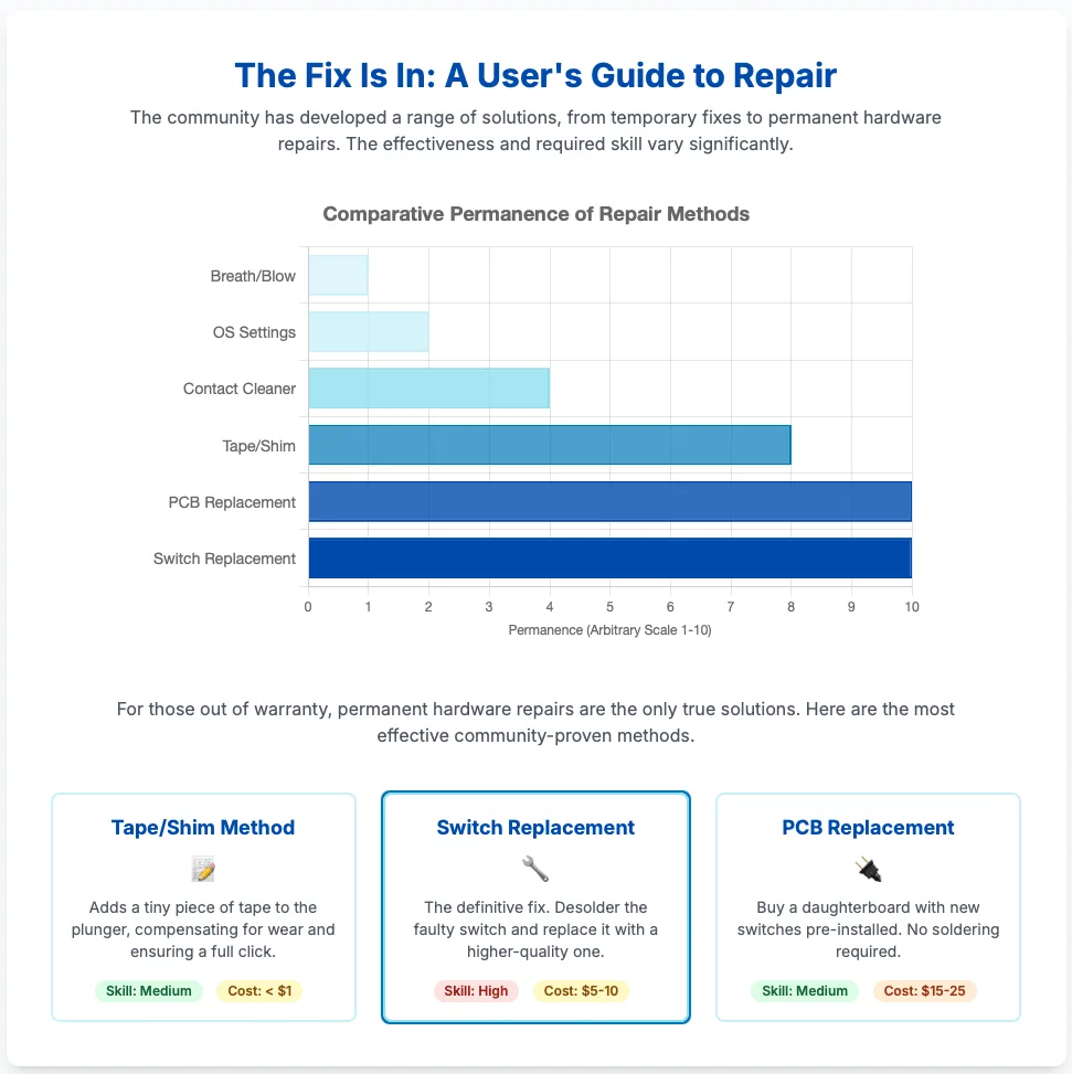 Community-developed solutions have proven highly effective, ranging from temporary fixes like the “breath method” (which works by using moisture to temporarily improve conductivity) to permanent repairs like replacing the faulty switch with a higher-quality component. Logitech’s official response has been to deflect from the hardware reality, focusing on ineffective software troubleshooting and managing the issue through warranty replacements while offering no support for out-of-warranty devices. This has created a void that has been filled by a vibrant right-to-repair community.