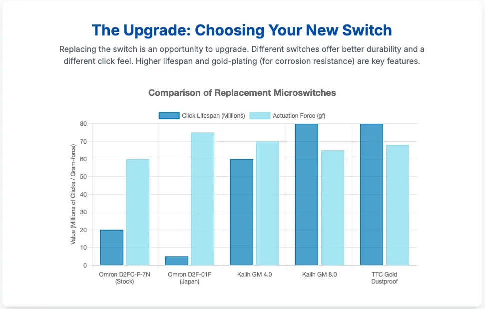 For those with high technical skill and soldering equipment, the definitive solution is Microswitch Replacement. This not only permanently fixes the issue but also offers an opportunity to upgrade the mouse’s feel and durability by selecting a superior aftermarket switch (refer to Table 1).