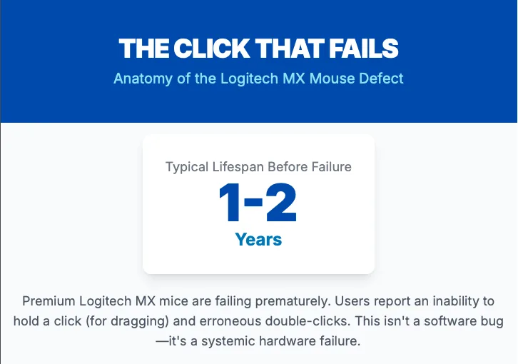 User reports document a consistent pattern of failure. A device that performs flawlessly for the first year or so begins to exhibit intermittent click failures that progressively worsen until the mouse becomes functionally unusable for many tasks.1 This problem is not isolated to a single model but is a recurring complaint across multiple generations of Logitech’s high-end mice, indicating a systemic issue rather than an anomalous manufacturing defect.3